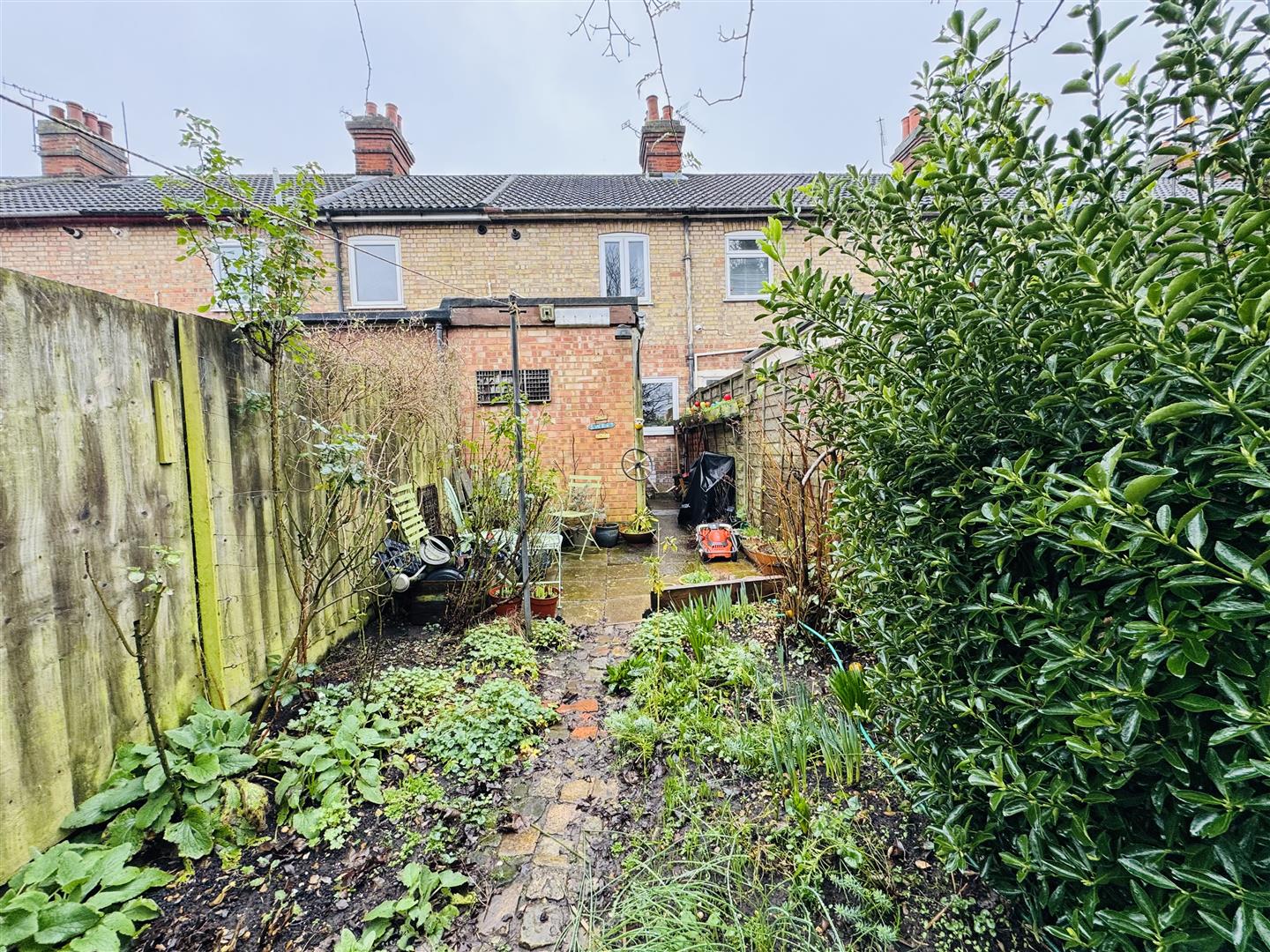 The enclosed rear garden has a small lawn, area, flowers and shrubs. Access to rear of garden via a gate. Backs onto railway line.