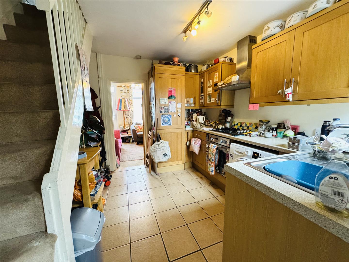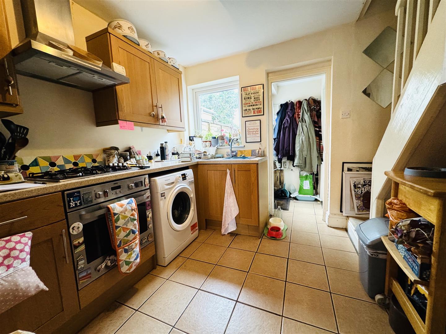 Double glazed window to rear, recess under stairs, range of wall and base units, sink and drainer, space fort appliances, tiled floor, stairs to 1st floor, door to