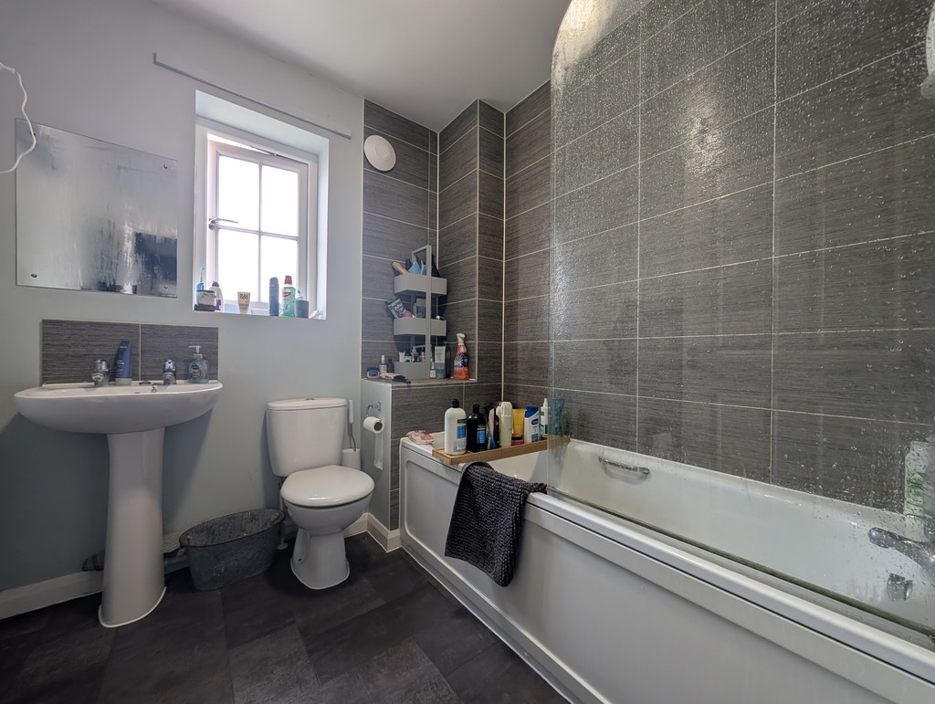 Modern white suite comprising panel bath with mixer shower over, WC and wash hand basin. Partially tiled walls and chrome heated towel rail.