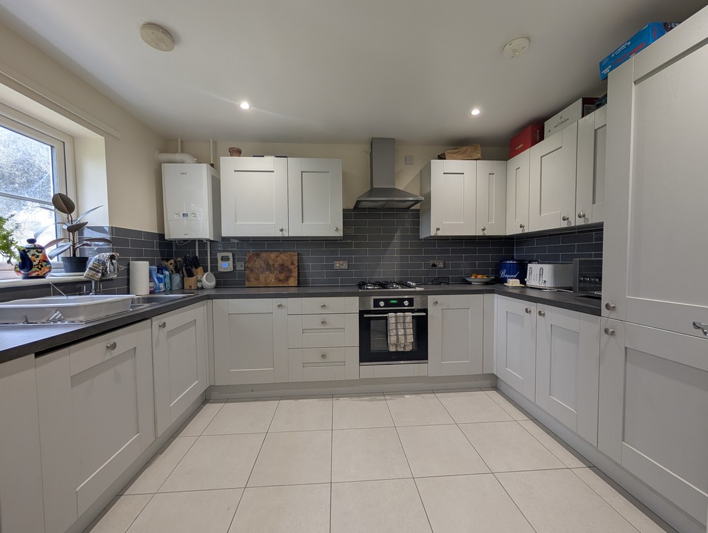 Window to the front aspect. Fitted with a range of high and low level Shaker-style units with work surfaces and tiled splashbacks. Double drainer stainless steel sink with mixer tap. Integrated fridge, freezer, oven, gas hob with extractor fan, dishwasher and washing machine. Wall-mounted gas combi boiler, tiled flooring and radiator.