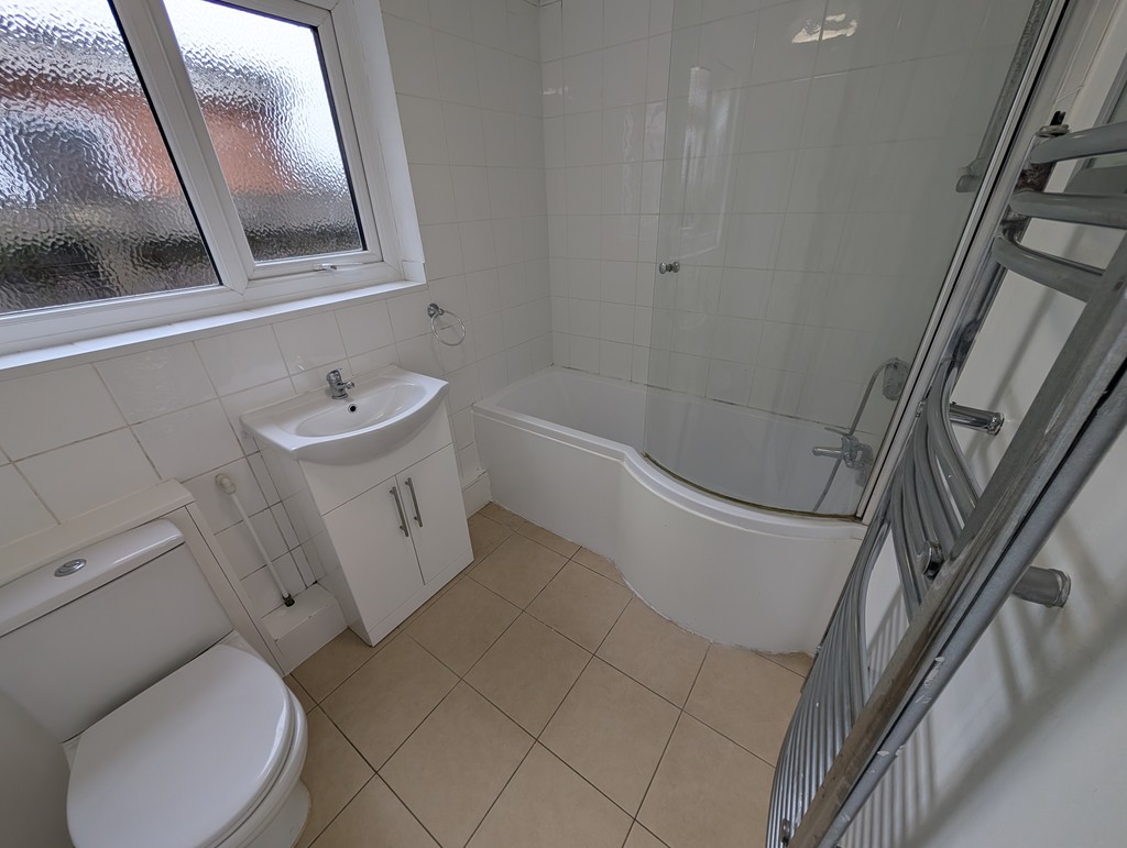 BATHROOM Window to the side, full white suite including a "P" shaped bath with shower over.