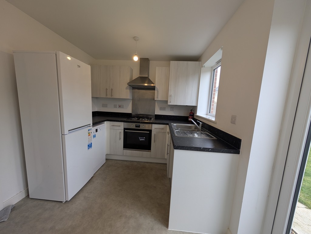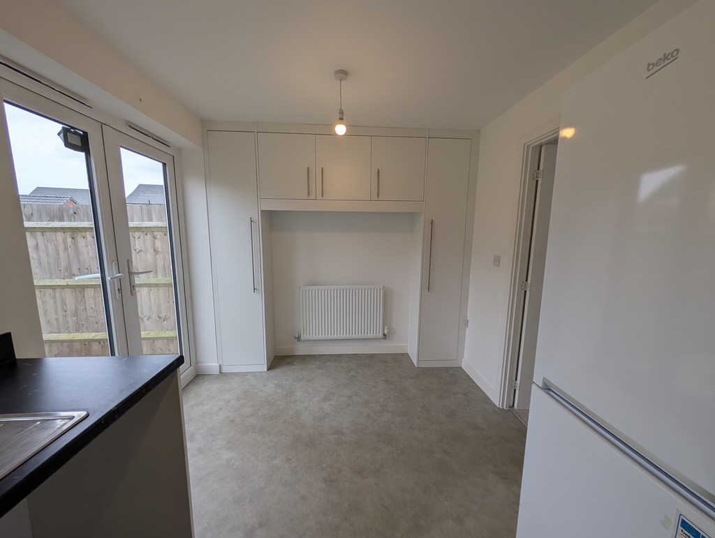 Spacious and modern, featuring a range of fitted base and eye-level units, work surfaces with inset sink and drainer, and integrated appliances including oven, hob, and extractor. There's space for a dining table and chairs, a double-glazed window overlooking the garden, and French doors opening onto the rear patio - ideal for entertaining. Fitted storage cupboards.