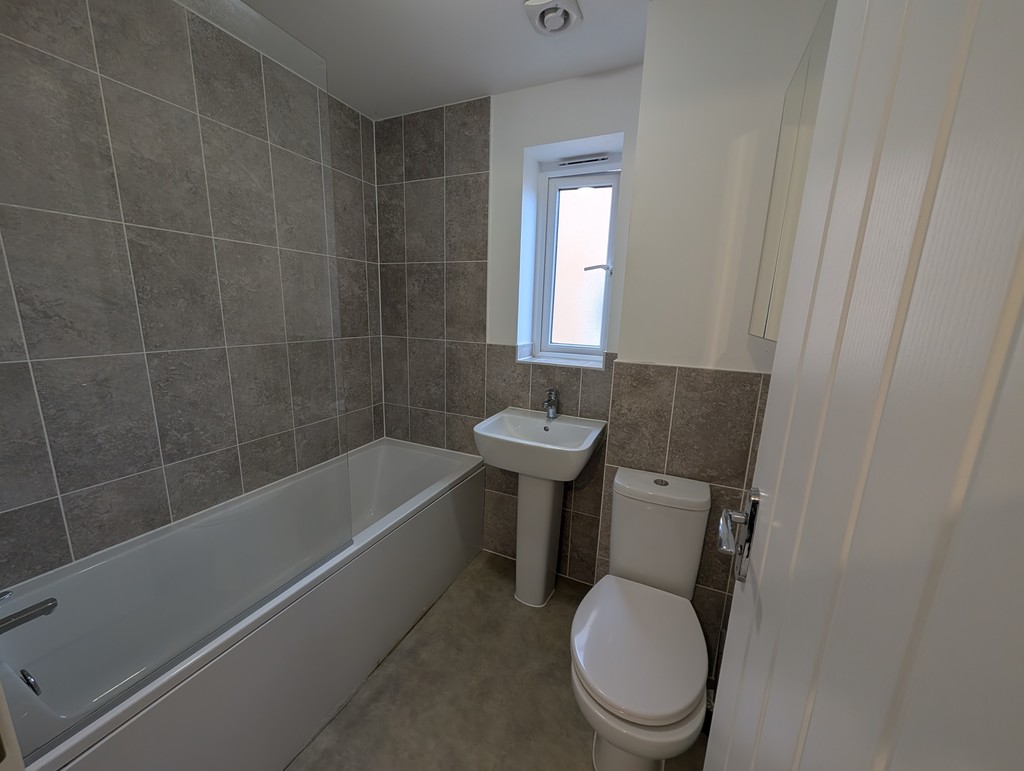 Modern white suite comprising bath with shower over and screen, pedestal wash basin, and low-level WC. Double-glazed window to the side and part-tiled walls.