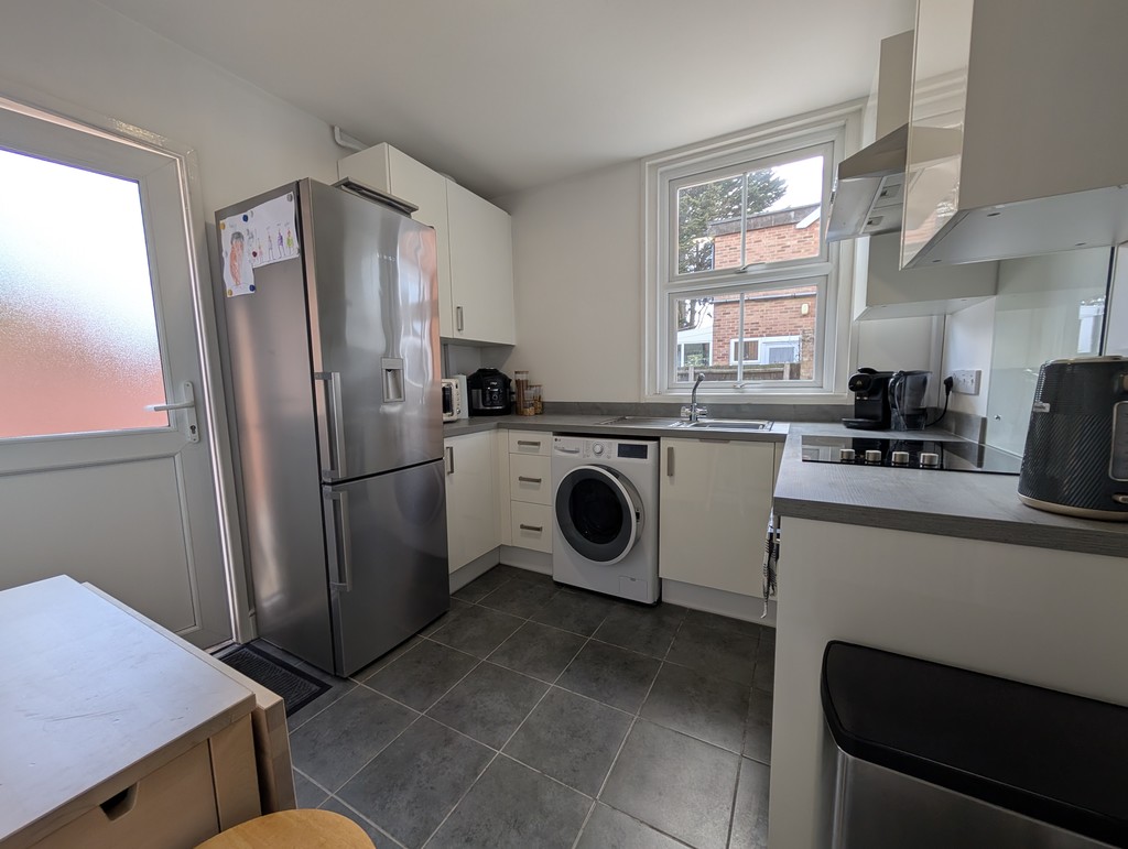 Fitted with a range of White base and wall units with formica worktop and inset stainless steel stink unit with chrome tap, inset 4 ring electric hob with chrome extractor hood over, electric oven below, space for washing machine, space for fridge/freezer, wall mounted cupboard house Logic gas fired boiler, UPVC window to front aspect, ceramic tiled floor, door to small garden and parking.