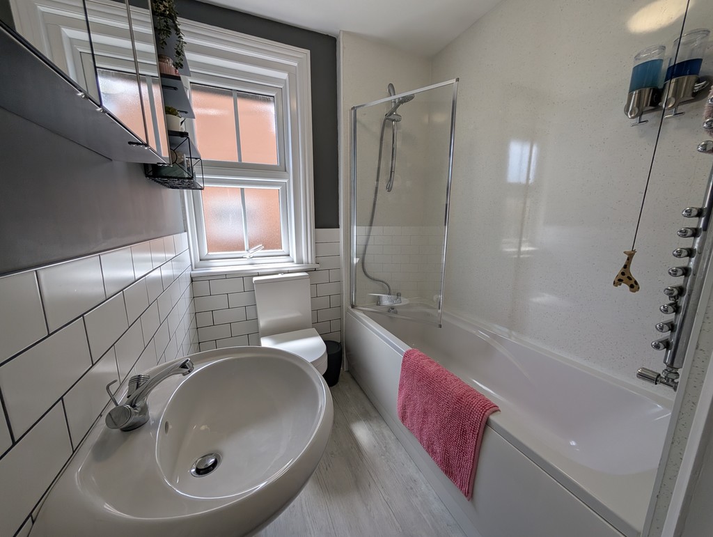 White suite comprising; Panel bath with shower attachment over, low level W.C, pedestal hand basin, laminate flooring, wall mounted chrome towel radiator, part tiled walls, UPVC window to front aspect.