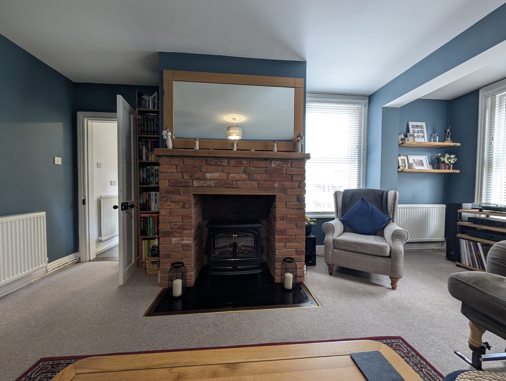 Double aspect room with two UPVC glazed windows to front aspect and side aspect, fitted carpet, feature brick fireplace with inset electric stove, radiators, door to understairs storage cupboard with electric for condensing tumble dryer and space for other items, door to: