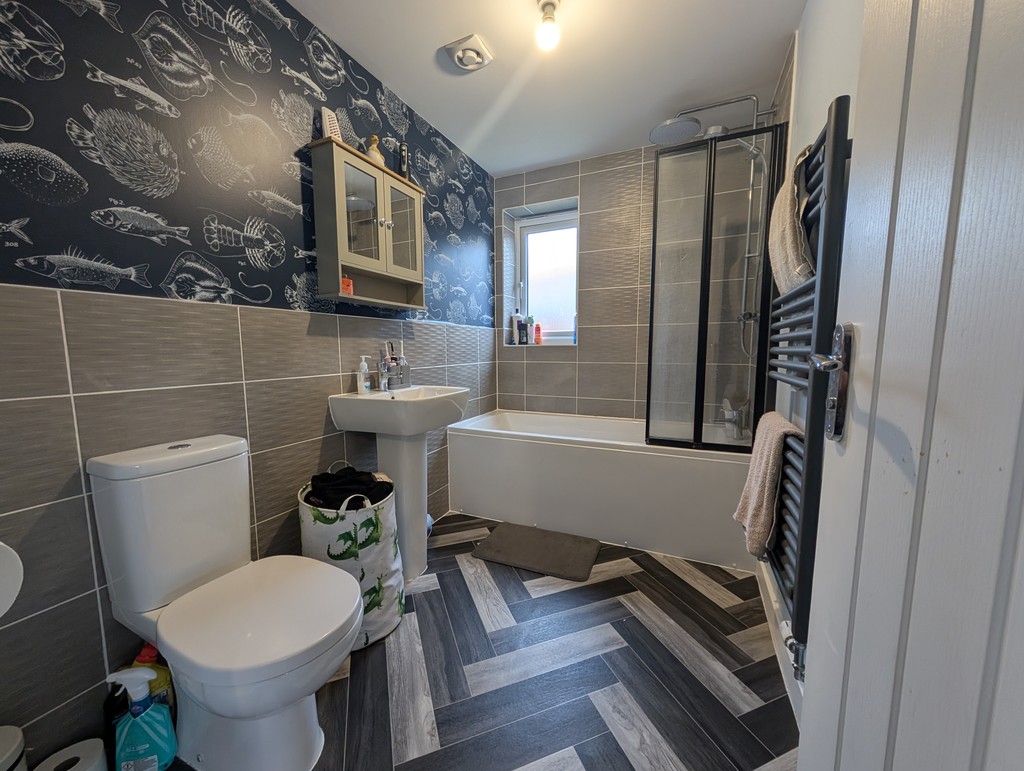 Comprising a panelled bath with overhead mixer shower and rainfall head, WC, pedestal wash hand basin, partially tiled walls, extractor fan, and rear-facing window.