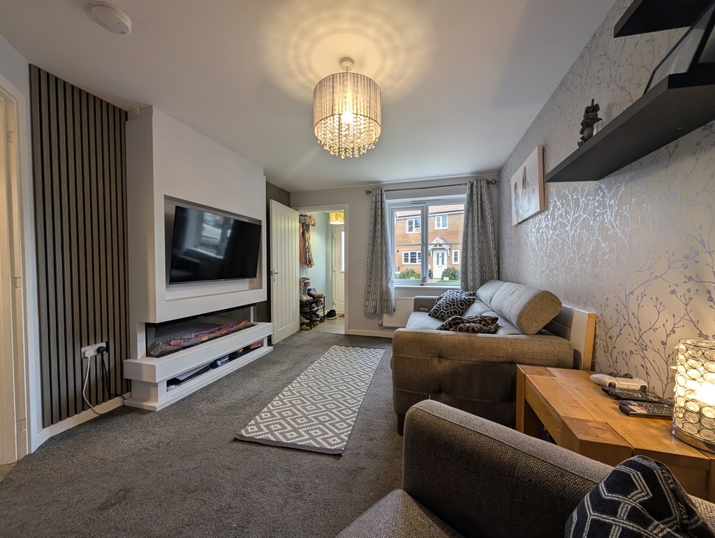 Positioned to the front of the property, the living room features a front-facing window, radiator, and an attractive media wall with wood panelling, inset electric fireplace, and space for a wall-mounted television, creating a stylish focal point.