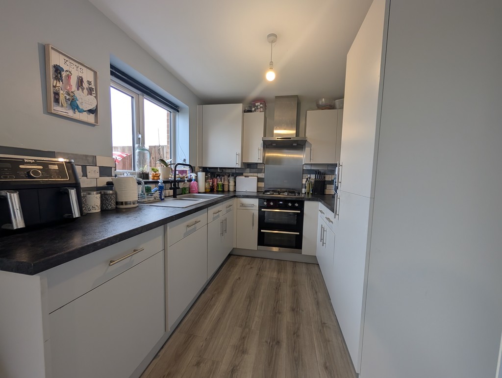 A bright and sociable space with a window and double doors opening onto the rear garden. The kitchen is fitted with a range of high and low-level units with tiled splashbacks and a double drainer sink with mixer tap. Integrated appliances include a double oven, gas hob with extractor fan, fridge/freezer, washing machine, and dishwasher. A wall-mounted gas combi boiler is neatly positioned, and the room offers ample space for dining and entertaining.