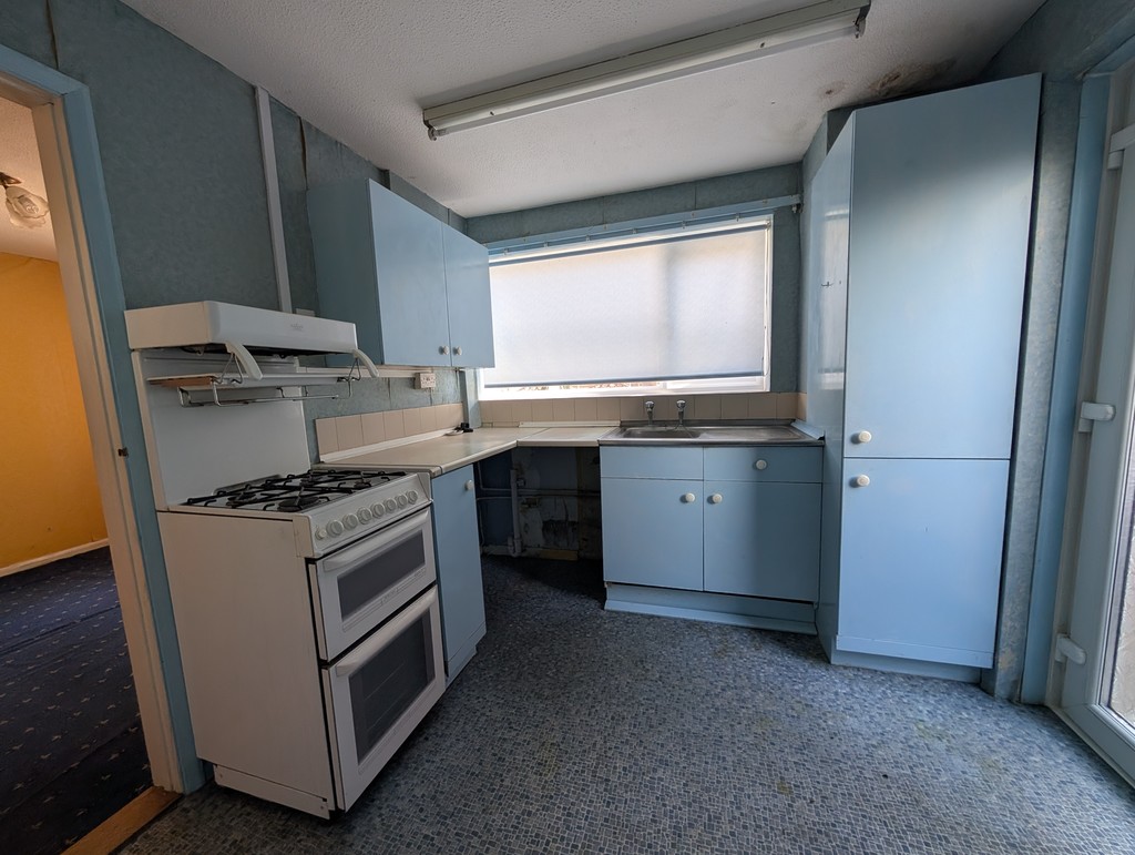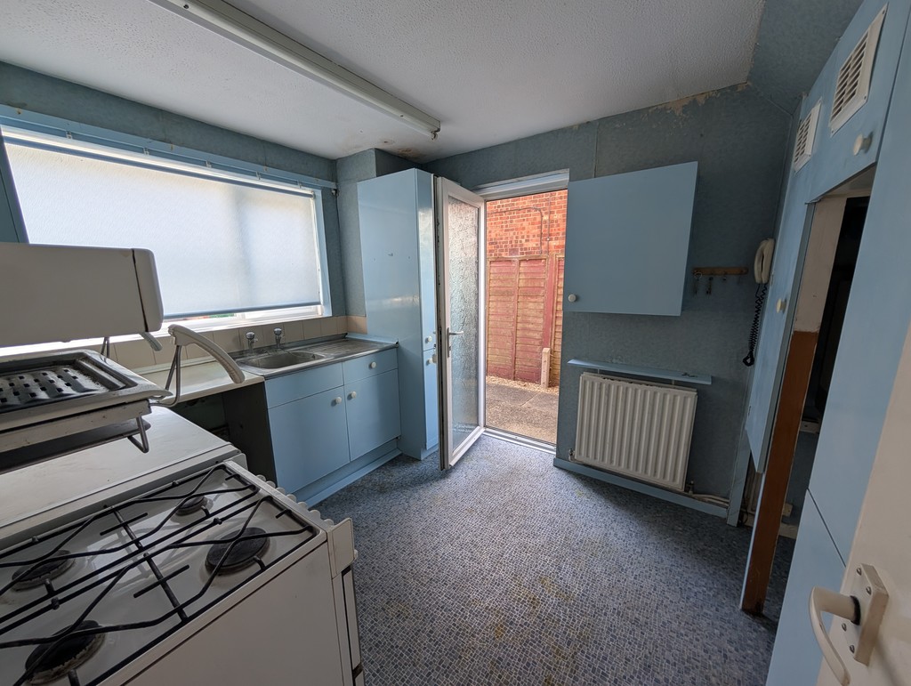 The kitchen lies at the rear and is fitted with a range of high and low-level units, a single drainer sink, radiator, and space for appliances. A door and window open to the rear of the property, giving garden access.