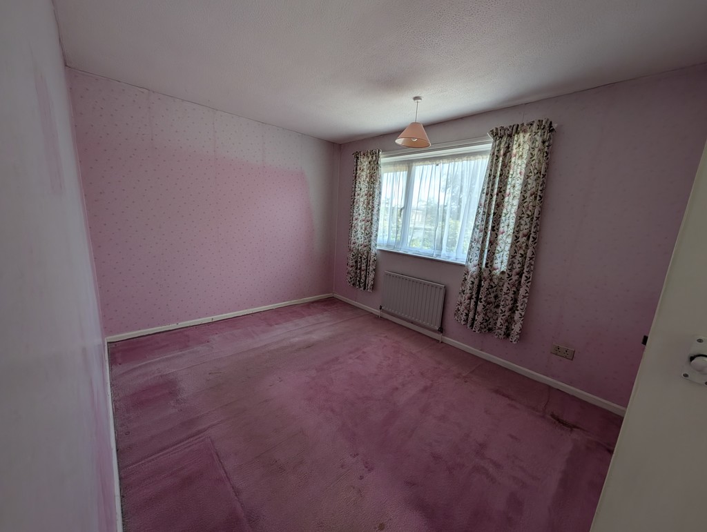 Bedroom one is a spacious double with a window to the front, radiator, and a large built-in cupboard housing the hot water cylinder. Bedroom two overlooks the rear garden and has a radiator, while bedroom three is positioned at the front.