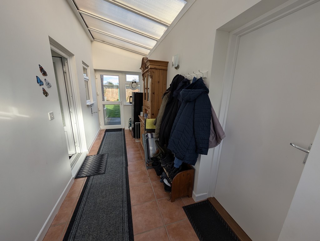 A UPVC glazed front door opens into an enclosed entrance porch with a polycarbonate roof, tiled floor, and windows to both the front and rear. A glazed door leads through to the rear garden, while an internal door provides access to the integral garage, which benefits from an up-and-over door, power and light connected - ideal for storage, a workshop, or conversion (subject to planning).