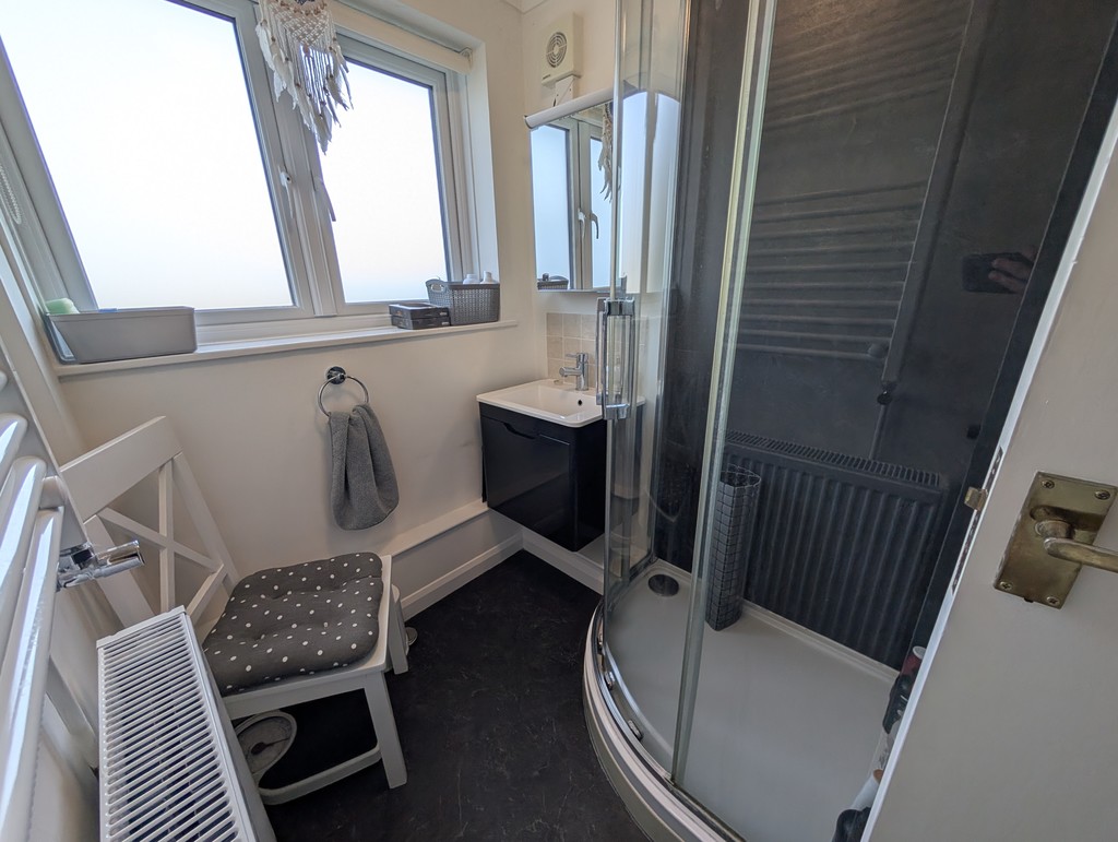 On the ground floor is also a modern shower room, featuring a corner shower cubicle with mixer shower and shower wall panels, wash hand basin with storage below, tiled splashbacks, heated towel rail, and window to the rear. A separate cloakroom includes a low-level WC and window to the side.
