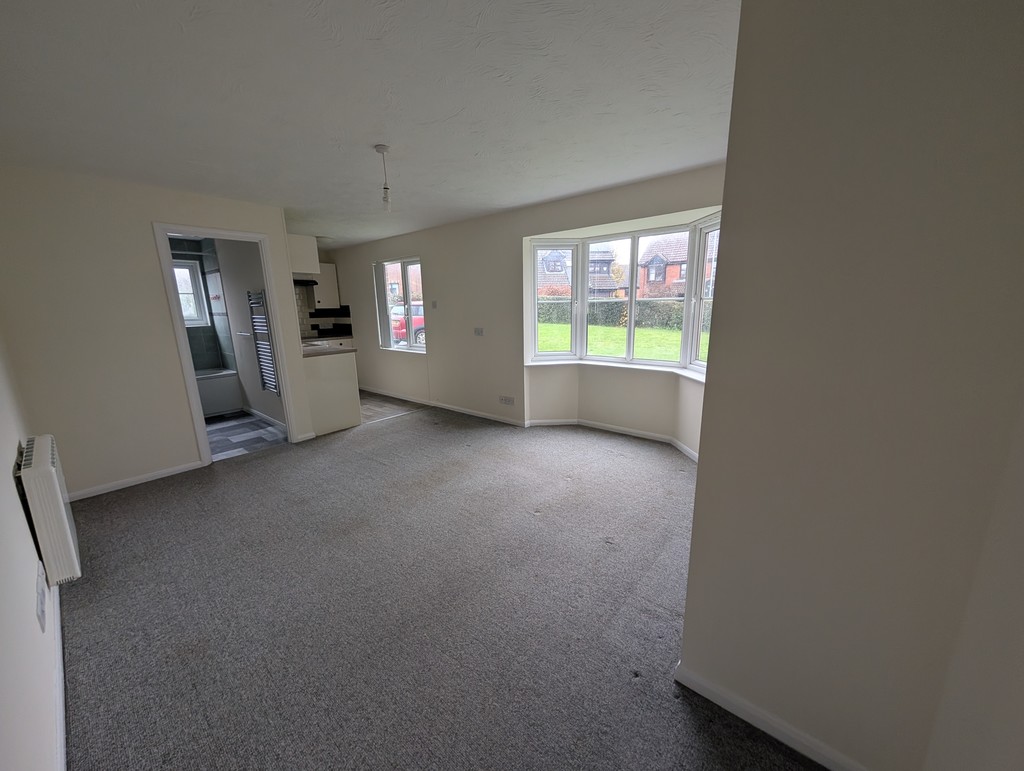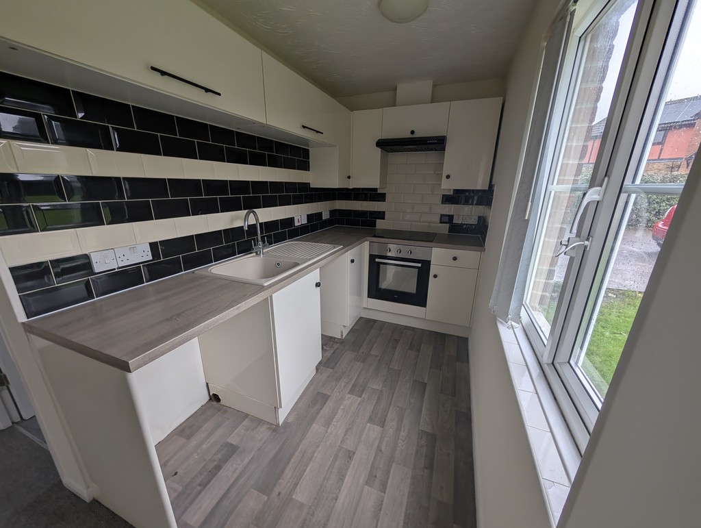 The sitting room is bright and welcoming, with a bay window overlooking the communal gardens. This leads through to a modern fitted kitchen which includes an electric oven, hob, tiled splashbacks, and space for appliances.