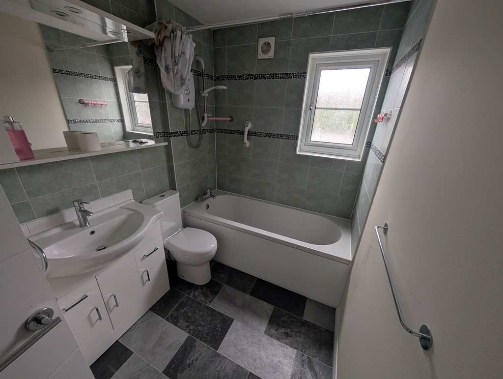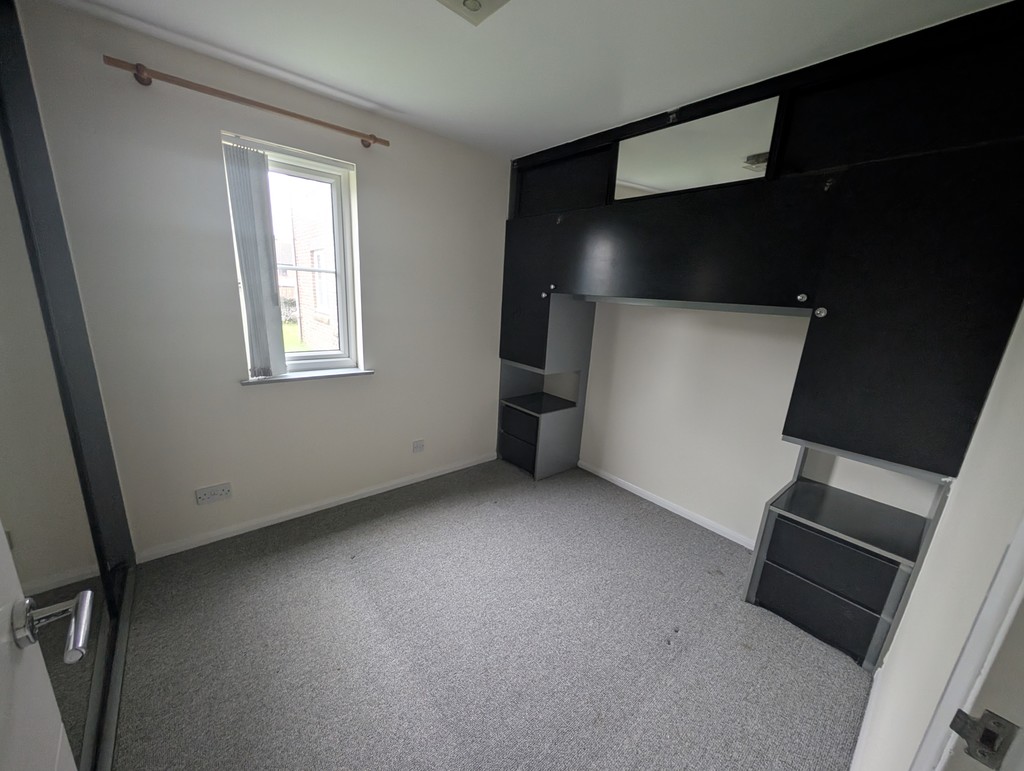 The double bedroom is positioned at the rear of the property and benefits from a fitted wardrobe offering useful storage. The bathroom has been updated and features a white suite with panelled bath, electric shower over, wash hand basin, WC, and part-tiled walls.