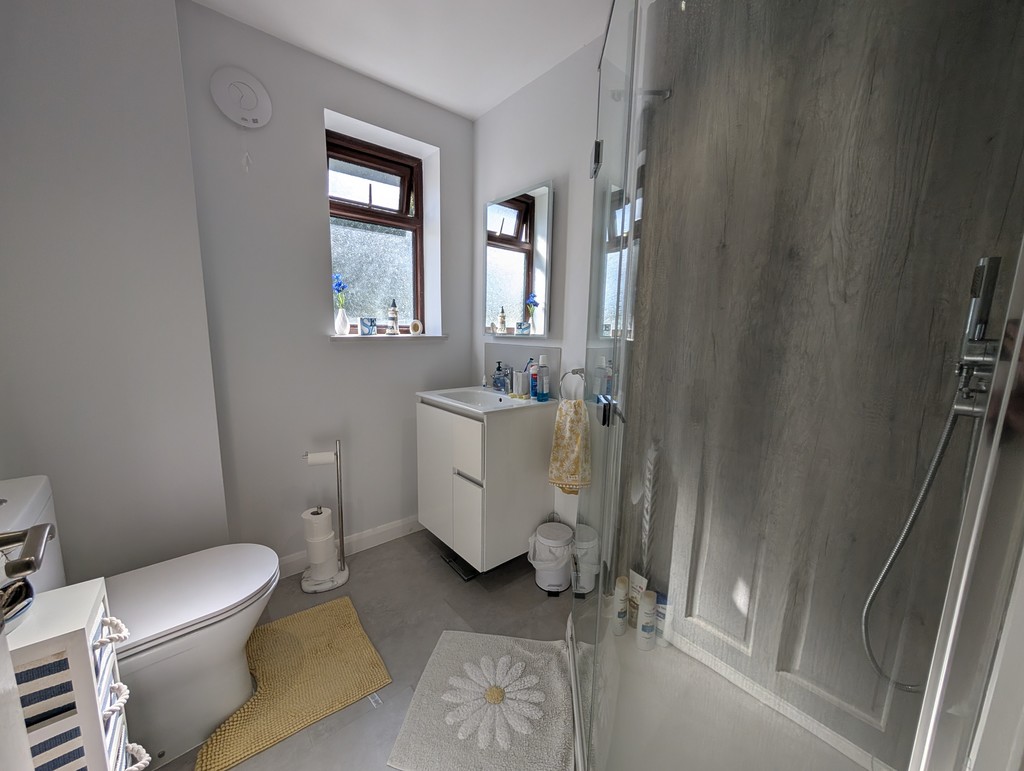 A modern, well-fitted shower room comprising corner cubicle with rainfall shower head and glass screen, wash hand basin set in vanity storage unit, and low-level WC. Heated towel rail, extractor fan, ceiling spotlights, and front-facing window.