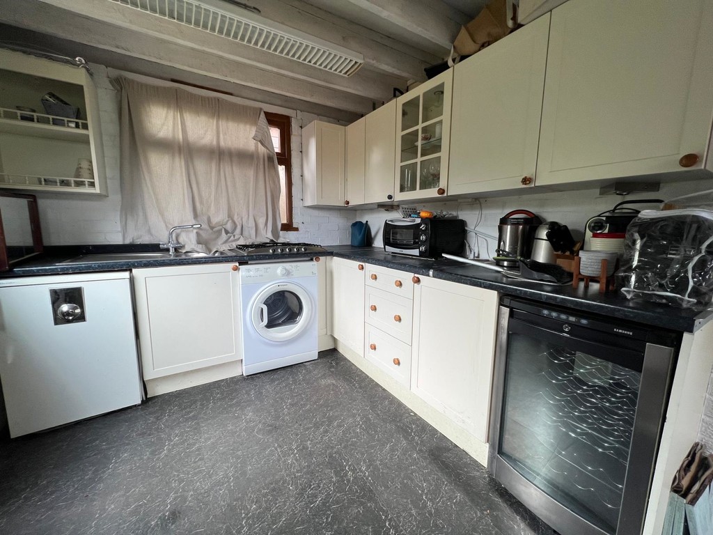 Fitted with a range of Beech fronted base and walls units, with roll edge worktops. 4 ring electric hob, with under counter double electric oven, space and plumbing for washing machine and dishwasher, space for fridge/freezer, larder cupboard, further wall and base units, uPVC door to side access and window to front, chrome towel radiator, wood effect flooring, inset spot lights. Floor standing oil Worcester boiler.