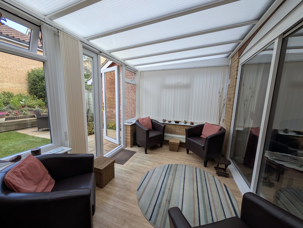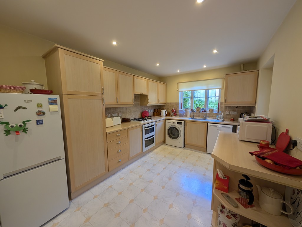The well-fitted kitchen/breakfast room offers a range of base and wall units with ample workspace, tiled surrounds, and integrated appliances including an oven, hob and extractor. A window overlooks the rear garden, while a side door also connects directly into the conservatory, making it a natural extension to the living space.