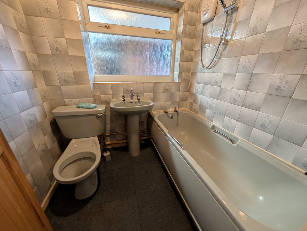 Suite comprising panel bath with overhead electric shower, pedestal wash basin and WC. Fully tiled walls and window.
