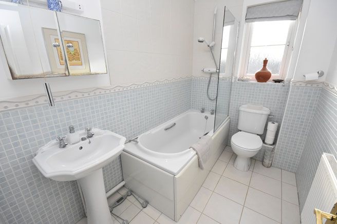 White suite comprising of a paneled bath with Aqualisa shower over and glazed splash screen to side, low level w.c., pedestal wash hand basin, tiled splash backs, extractor, radiator, obscure window to rear aspect.