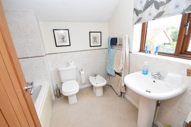 Pale suite comprising of paneled bath with mixer tap over, integrated shower over with curtain and rail to side, dual flush low level w.c., bidet, pedestal wash hand basin, heated towel rail radiator, window to side aspect.