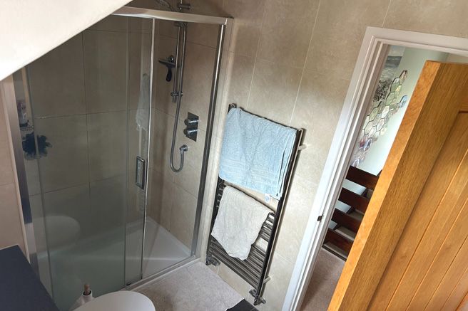 with work surfaces above. Low level w.c., with concealed cistern, shower cubicle with integrated mixer, sliding glazed door, heated towel rail radiator, window to front aspect.
