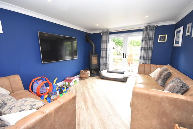 Feature wood burning stove, window to front aspect, two radiators, patio doors to rear garden and patio.