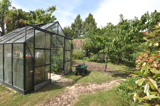 Five bar gate leads to a tarmacadam drive with vehicular parking. The garden enjoys a southerly aspect, mainly laid to lawn with borders and a side access to: