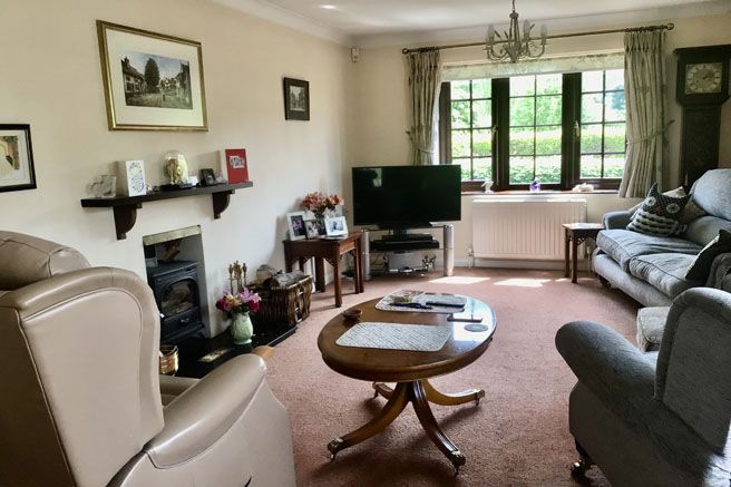'L' shaped room with feature open fireplace incorporating a wood burning stove with wooden mantel and raised slate hearth, three radiators, television point, smoke detector, double glazed sliding patio doors to paved courtyard area and windows to the front and side aspects.