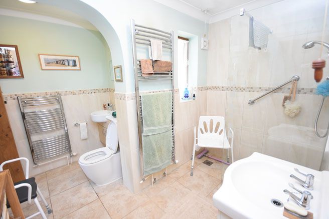 With walk in wet room shower, wall mounted mixer shower, inset wash hand basin with vanity cupboard under. Half tiled limestone effect wall tiles and splash backs, two heated towel rail radiators, extractor, obscure windows to the side and front aspects. Second wash hand basin and wc, door to: