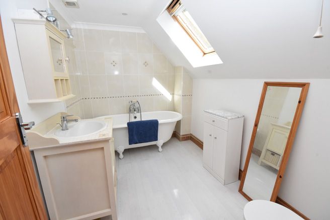 Comprising of white roll top bath, wash hand basin, dual flush low level WC, towel rail radiator, velux window.