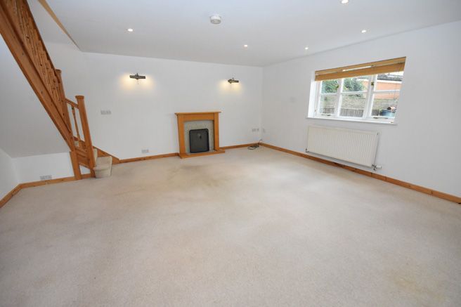 Feature fireplace with wooden surround and mantel housing an electric fire, television point, radiator, inset spotlights, staircase to first floor, windows to front and side aspects.