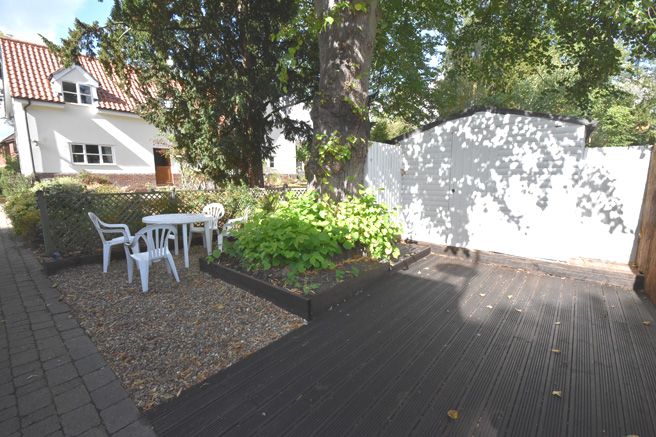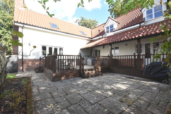 Leading round to the rear of the house, there is a spacious decked verandah which can be accessed by both the kitchen/breakfast room and the family room, with steps down to the patio which is laid to 'Jeronda' French limestone effect paving. Both properties are enclosed by close border fencing and red brick walling.