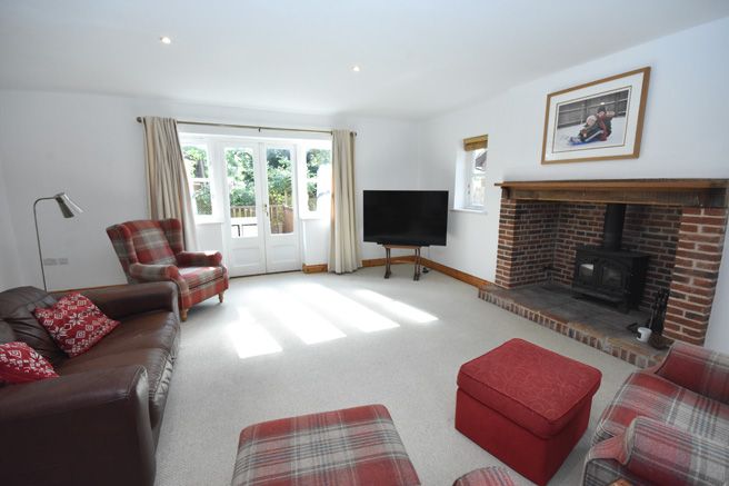 Feature inglenook fireplace with wood burning stove under an oak bressummer. Double aspect windows with views to both the front and side aspects and double opening doors lead onto the patio area.