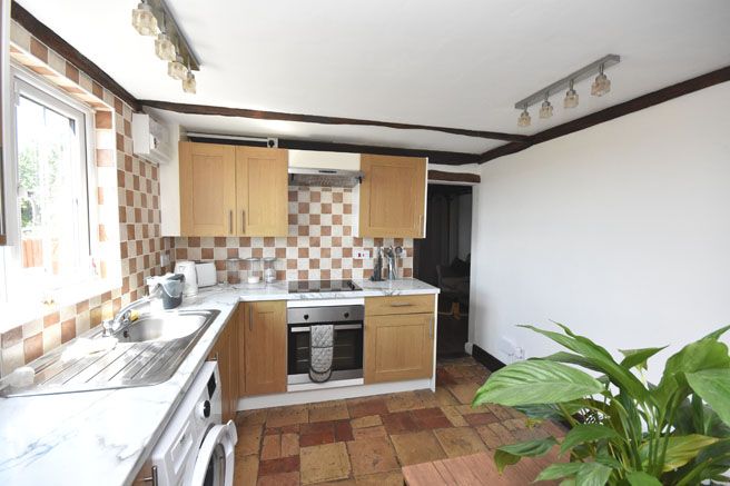 Fully fitted oak fronted units, cupboards and drawers under butchers block wooden work surfaces, sink and drainer, inset oven, hob and extractor, plumbing for washing machine, Suffolk pamment floor, window to side aspect.