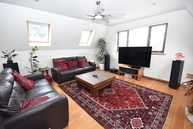 A light and airy room with window to the front aspect and three velux windows to side, feature fireplace with electric fire, wood surround under a wooden mantel. Radiator, exposed oak wooden floor, built-in eaves storage cupboards, ceiling fan.