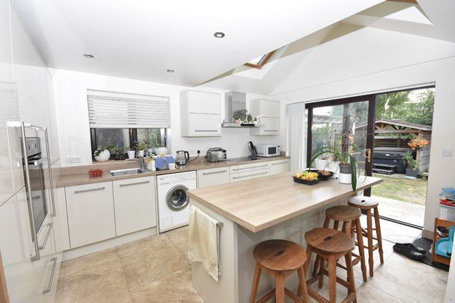 Contemporary fitted gloss cream fronted high and low level units, cupboards and drawers under roll edge wood effect work surfaces with matching island. Stainless steel sink + drainer with 'Hansgrohe' mixer tap, inset ceramic induction hob with stainless steel chimney style extractor over, built-in Miele oven, plumbing for washing machine, built-in dishwasher, fridge and separate freezer. Part vaulted ceiling with two velux windows, sliding glazed doors to patio, double opening French doors to Conservatory, window to side aspect, open plan through to: