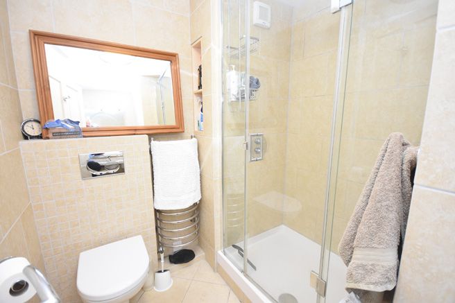 With white suite comprising wall mounted wash hand basin with Grohe contemporary mixer, Geberit dual flush WC with concealed cistern. 1200 x 900 dual control shower enclosure with rainwater head shower, glazed pivot door, heated towel rail radiator.