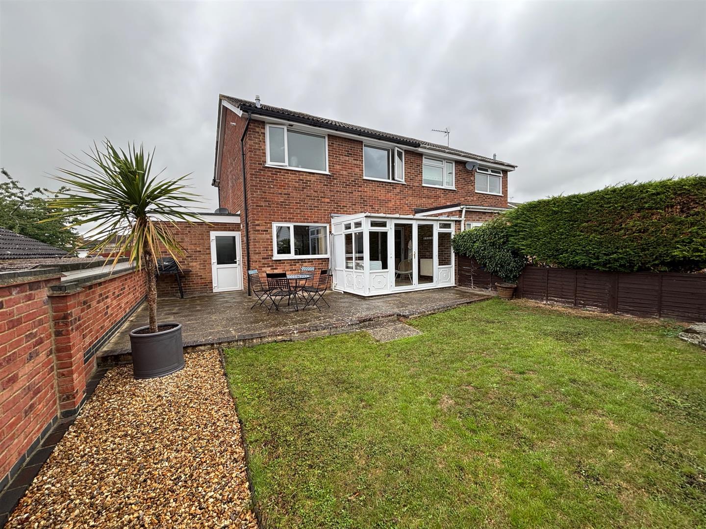 Laid to lawn brick and fenced surround, patio and access to garage.