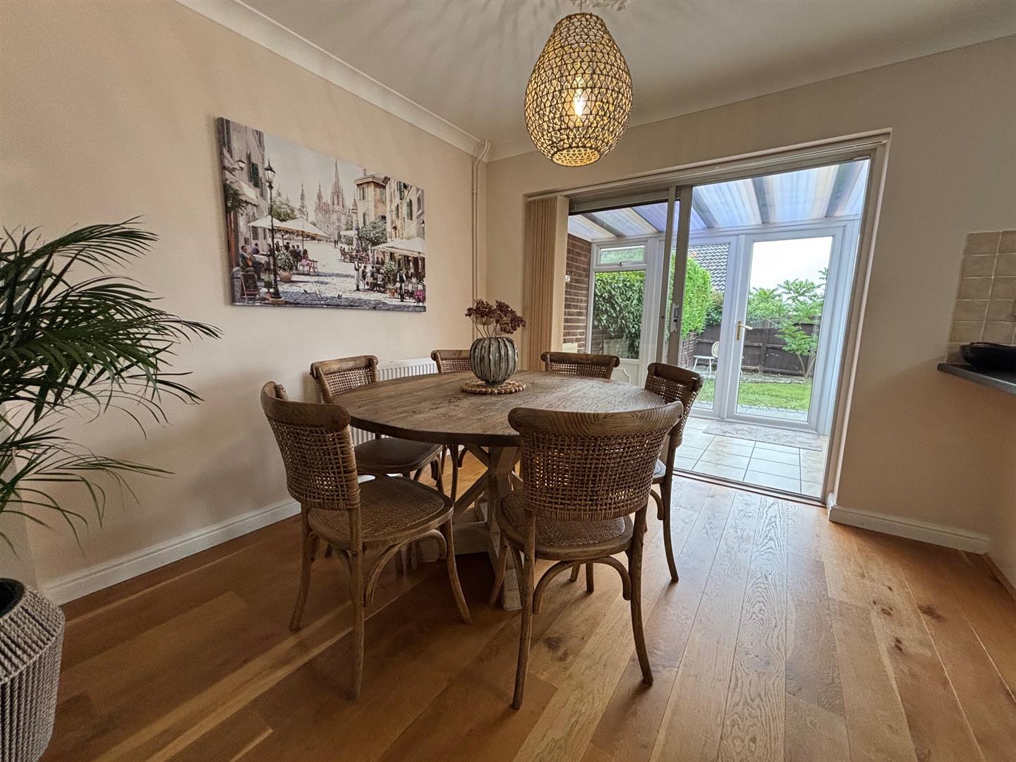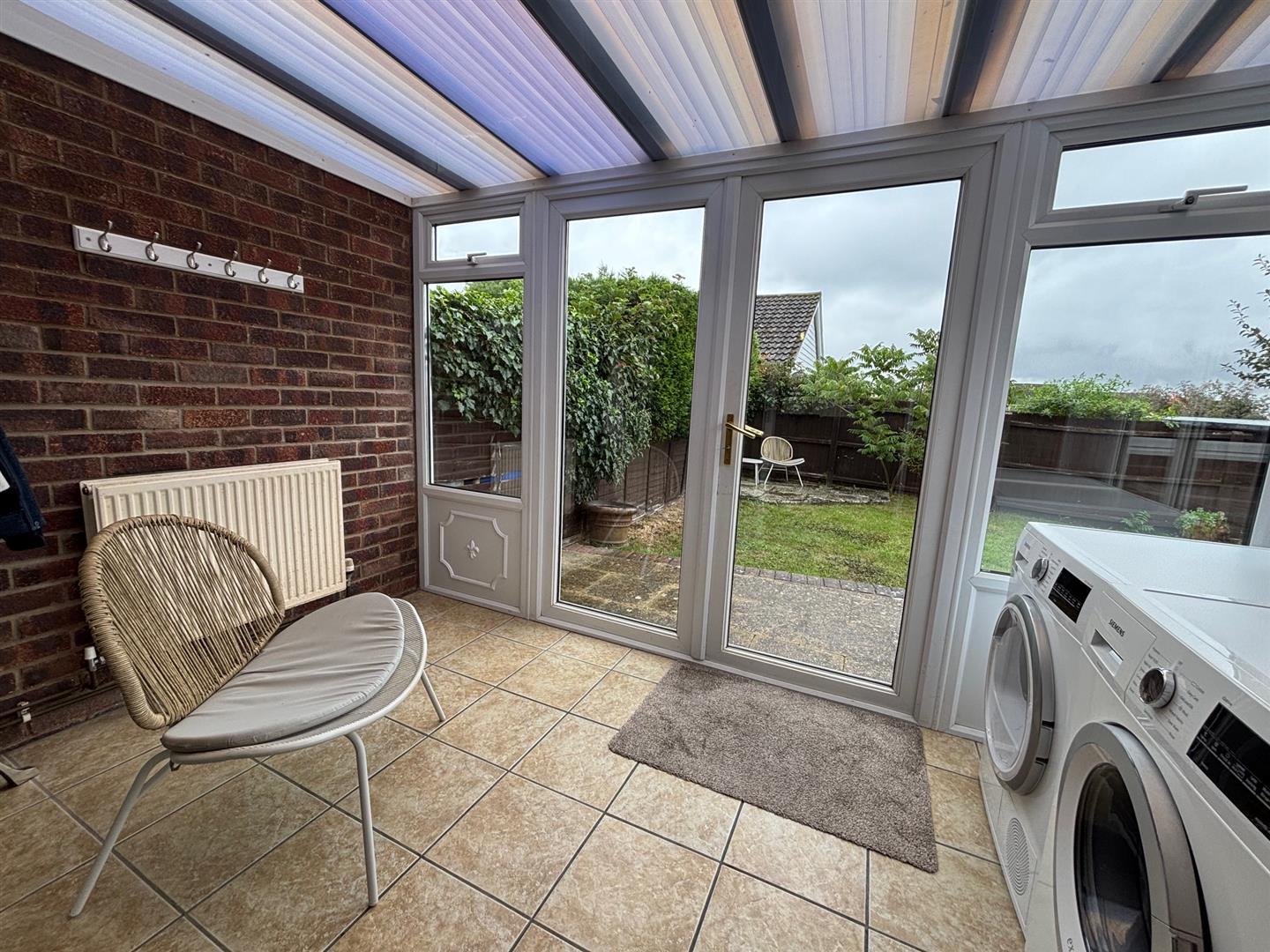 Doors to conservatory, window to rear, range of wall and base units with work surfaces over and tiled splashbacks. Stainless steel sink with mixer tap. Built in electric hob and oven. Space for fridge/freezer.
