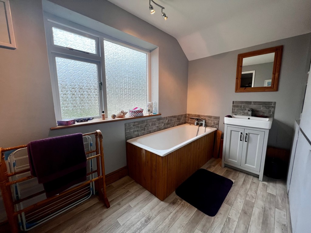 BATHROOM heated towel rail, alcove with space for tumble dryer, window to rear aspect, bath with shower mixer tap, hand basin with fitted unit, large built in storage cupboards