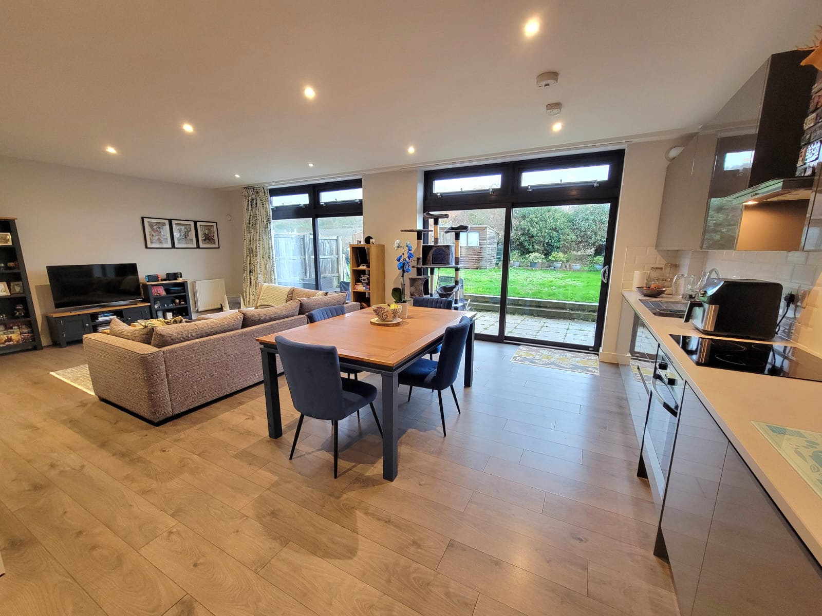 26' 9" x 17' 3" (8.15m x 5.26m) With 8'6" high ceiling. Two separate full height double glazed French doors 8'7" wide, inset spotlights, ash grey wood effect flooring, extensively fitted kitchen with a good range of contemporary styled base and wall mounted units having high gloss doors and drawer fronts, fitted worktops inset with one and a half bowl stainless steel sink unit with mixer tap, inset black glass four ring ceramic hob, opaque glass splash back, stainless steel extractor connected over, integrated black glass and stainless steel fan assisted oven, integrated fridge/freezer and dishwasher, wall mounted gas fired boiler concealed within a cupboard, attractive metro style wall tiling, tv point.