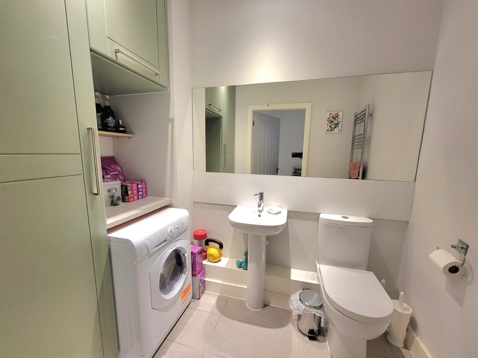 6' 3" x 5' 8" (1.91m x 1.73m) Low level wc, pedestal wash hand basin with mono mixer tap, large vanity mirror, good quality built-in shaker style storage cupboards, inset shelving, plumbing for washing machine, tiled floor, wall mounted chrome towel radiator, inset spotlights.