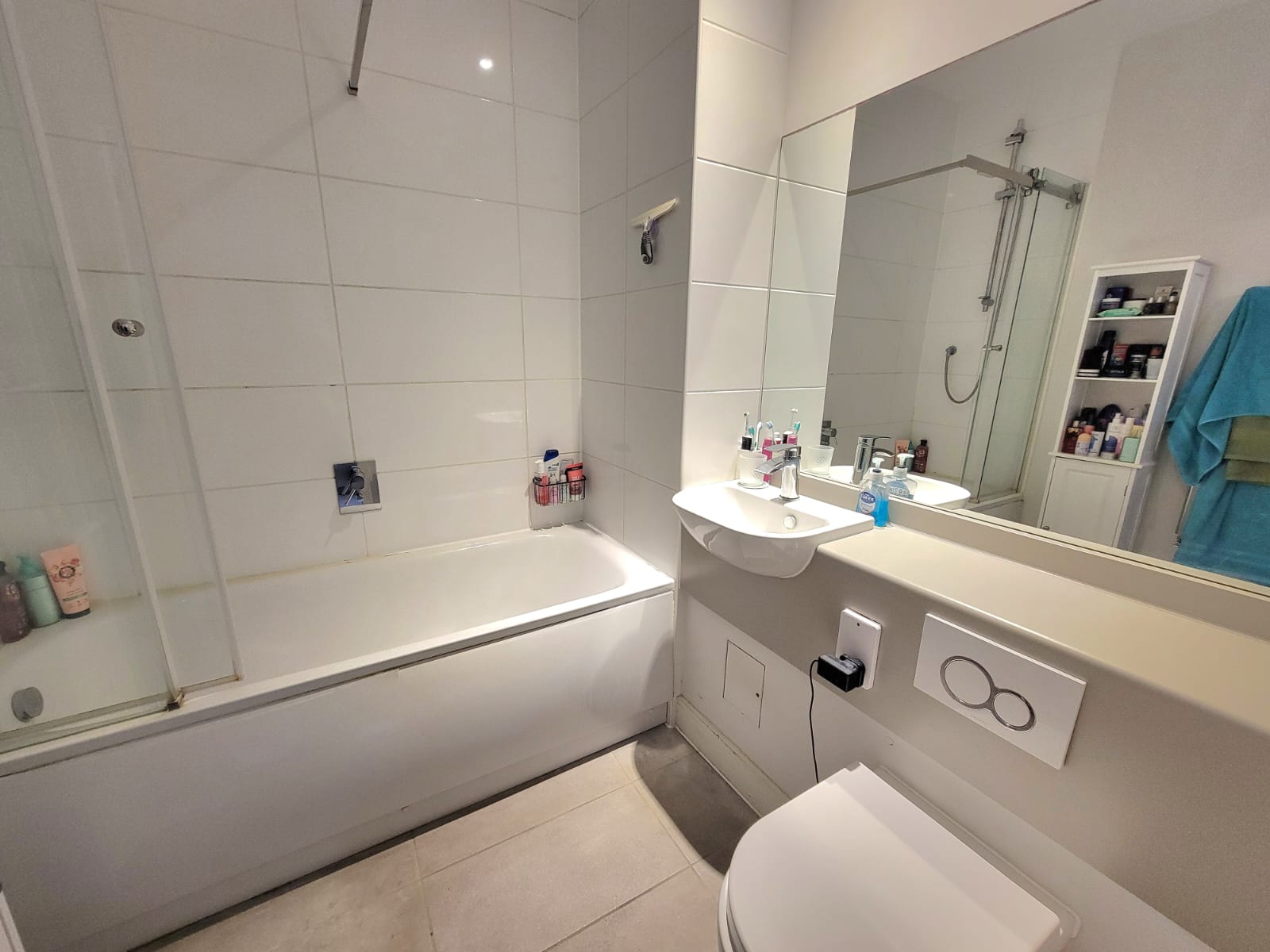 7' 9" x 5' 6" (2.36m x 1.68m) Contemporary white suite comprises steel panel bath with shower mixer tap, shower connected over and pivot glazed screen, vanity unit with inset wash hand basin with mono mixer tap and low level wc with concealed cistern, chrome towel radiator, extensive wall tiling, spotlights, tiled floor.