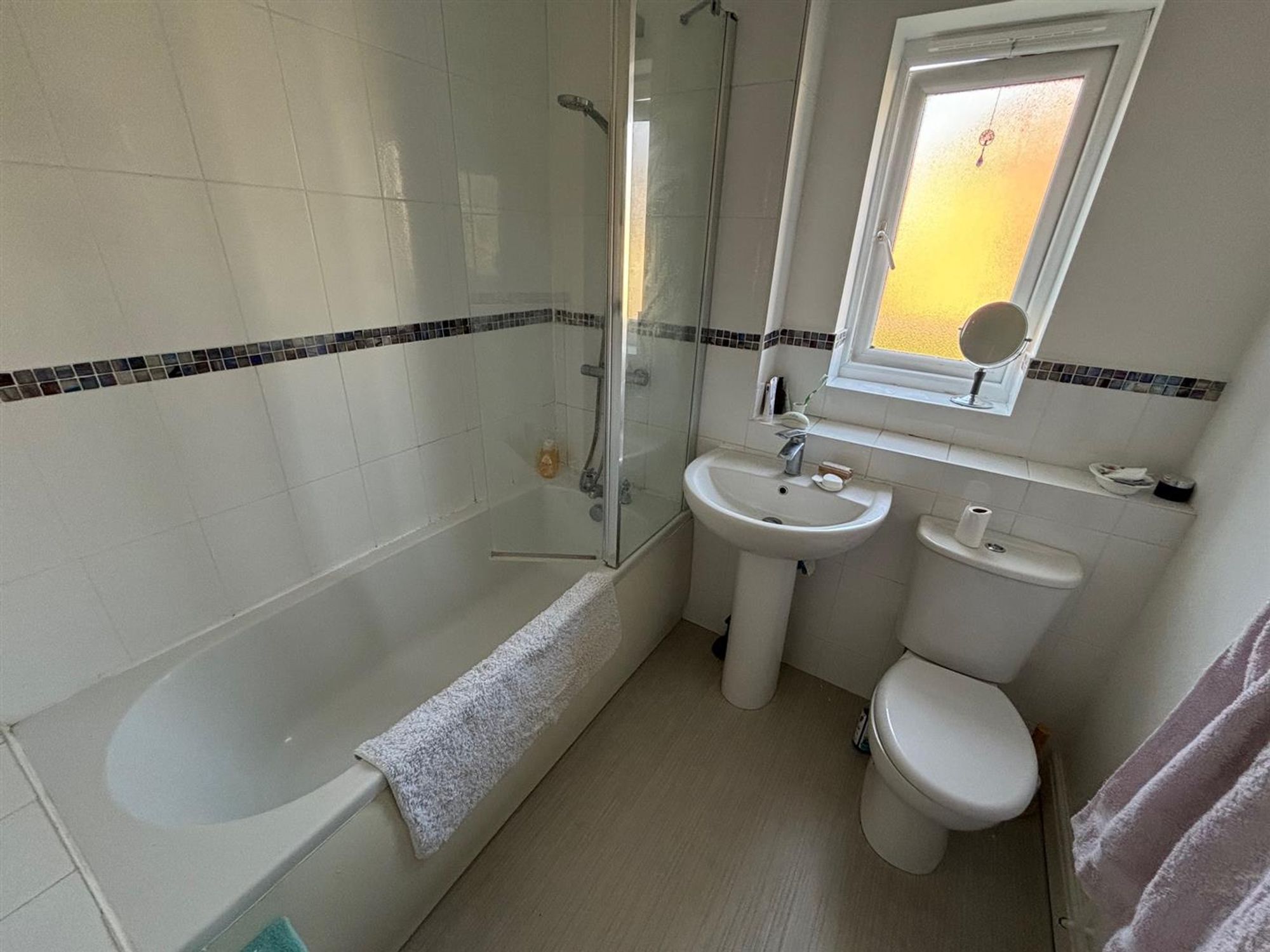Bathroom: Double glazed window to rear, paneled bath with shower over, low level w/c and hand wash basin.