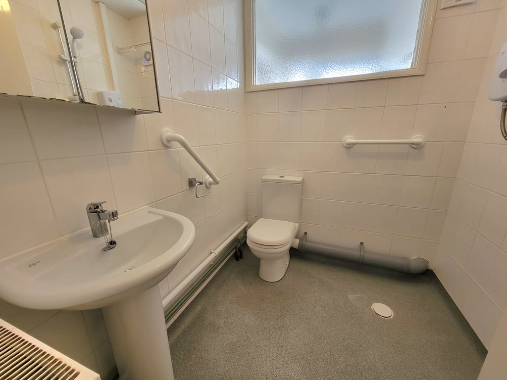 SHOWER ROOM/WETROOM: 6' 3 " x 5 ' 5 " (1.91m x 1.65m) White suite comprises low level wc, pedestal wash hand basin and walk-in shower with non slip flooring, radiator, fully tiled walls, screen style window to the front aspect.