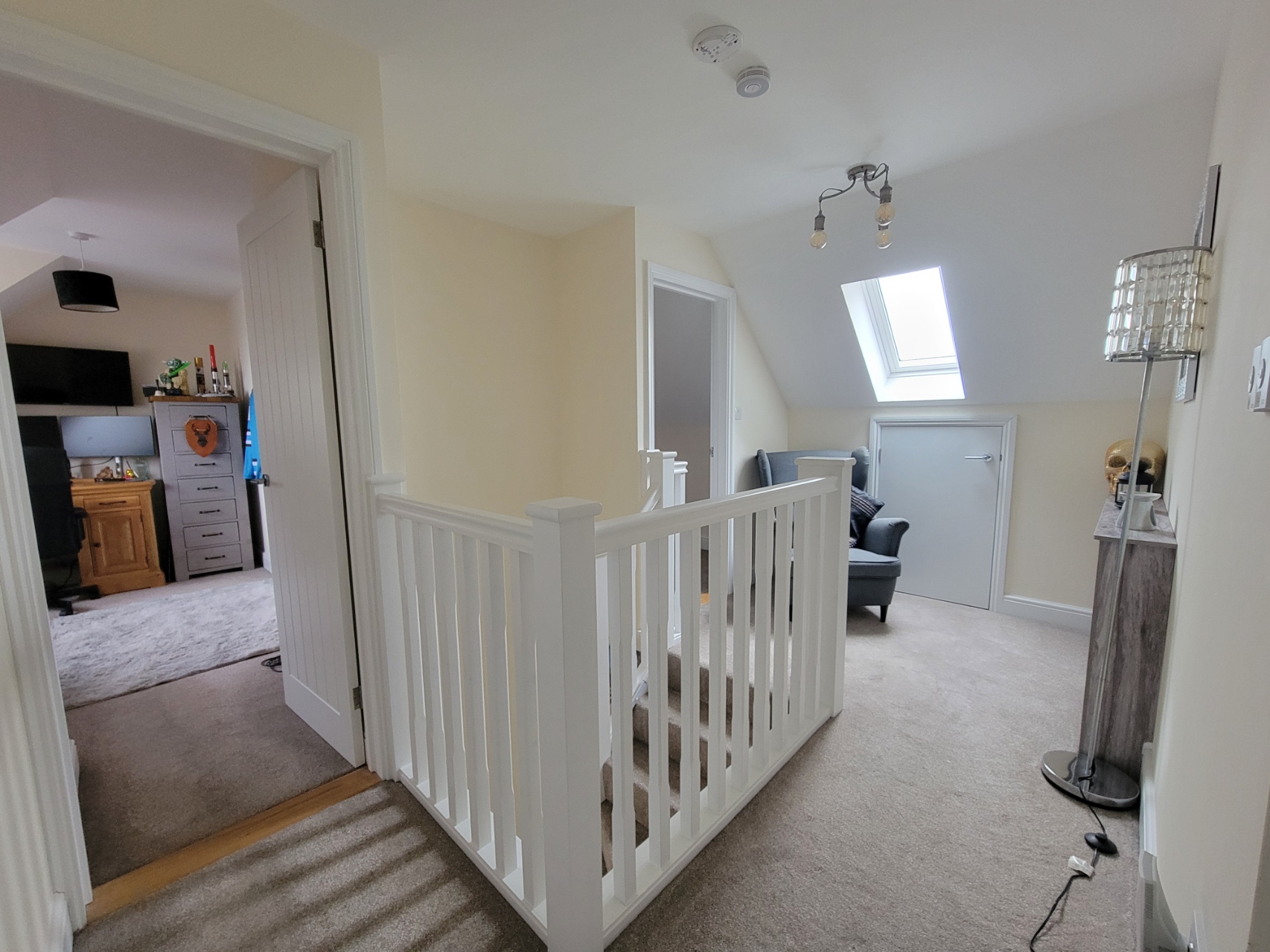 First floor galleried landing: 13' 2" x 7' 0" (4.01m x 2.13m) Decorative balustrading, deep eaves storage cupboard, access to the insulated loft space, radiator, Velux roof window to the front aspect.