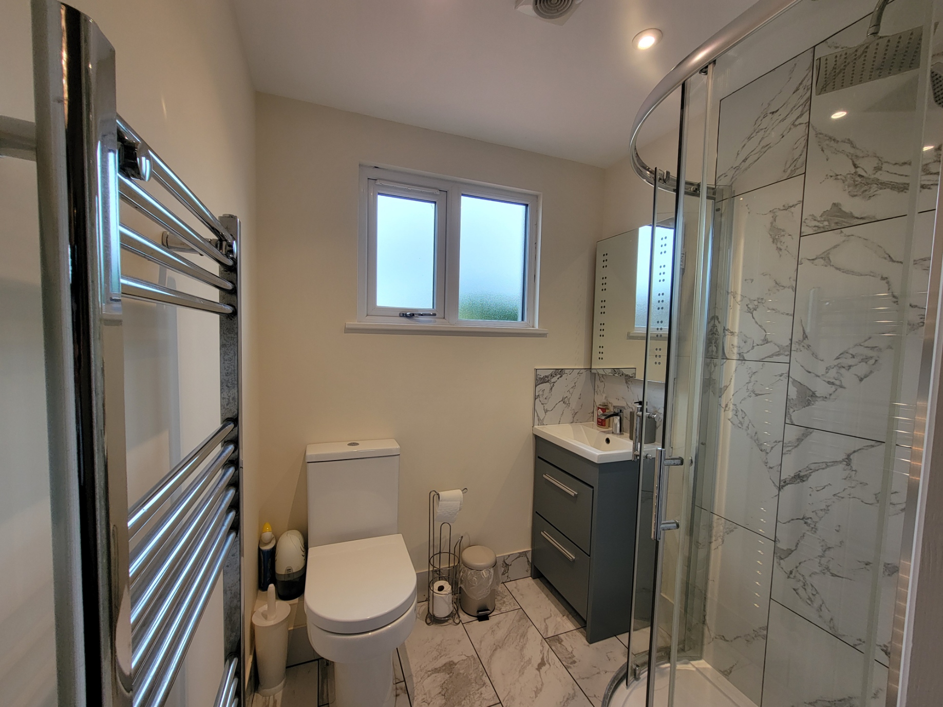 En-suite: Contemporary suite comprises independent shower enclosure with curved glazed screen, low level wc and vanity unit with wash hand basin and mono mixer tap and storage drawers below, wall mirror with electric light, chrome towel radiator, extensive marble effect wall and floor tiling, extractor fan, PVC double glazed window to the rear aspect.