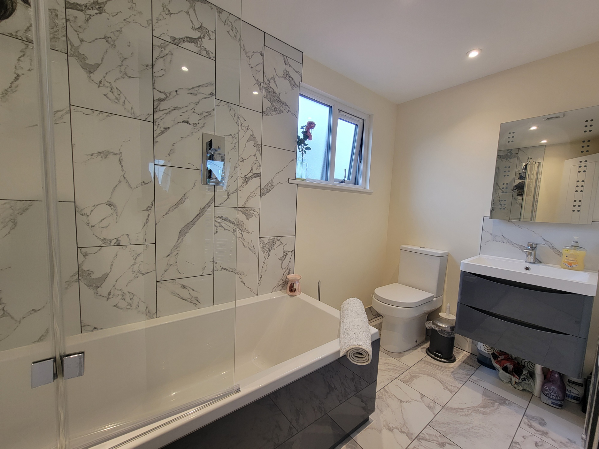 Family bathroom: Contemporary white suite comprises panel bath with shower connected over and glazed screen, low level wc and vanity unit with wash hand basin, mono mixer tap and storage drawers below, mirror with electric light, chrome towel radiator, inset spotlights, extractor fan, extensive marble effect wall and floor tiles, PVC double glazed window to the rear aspect.