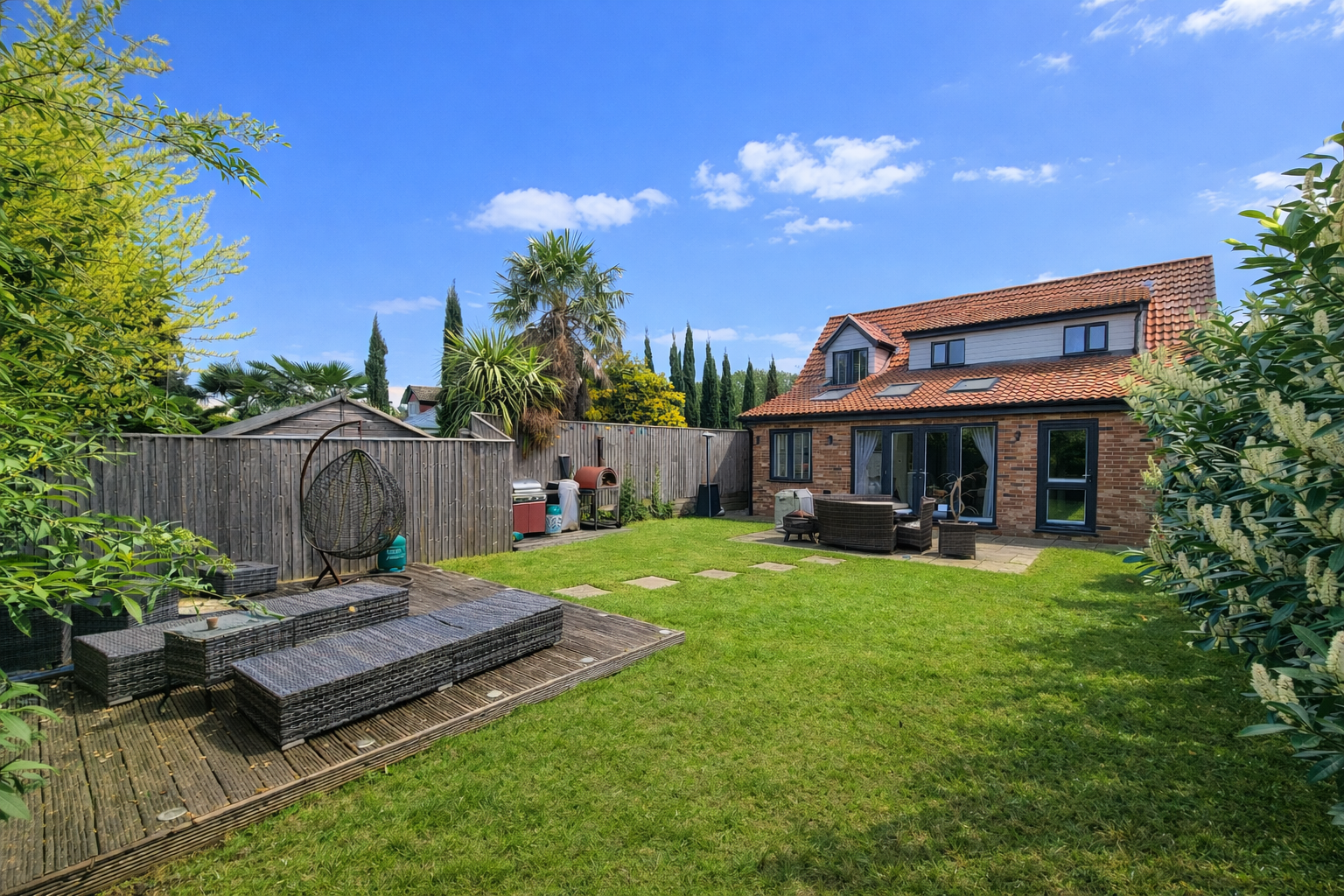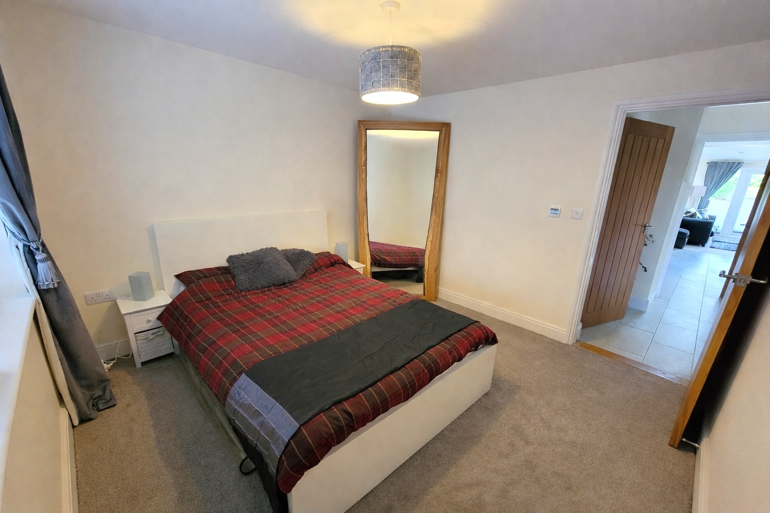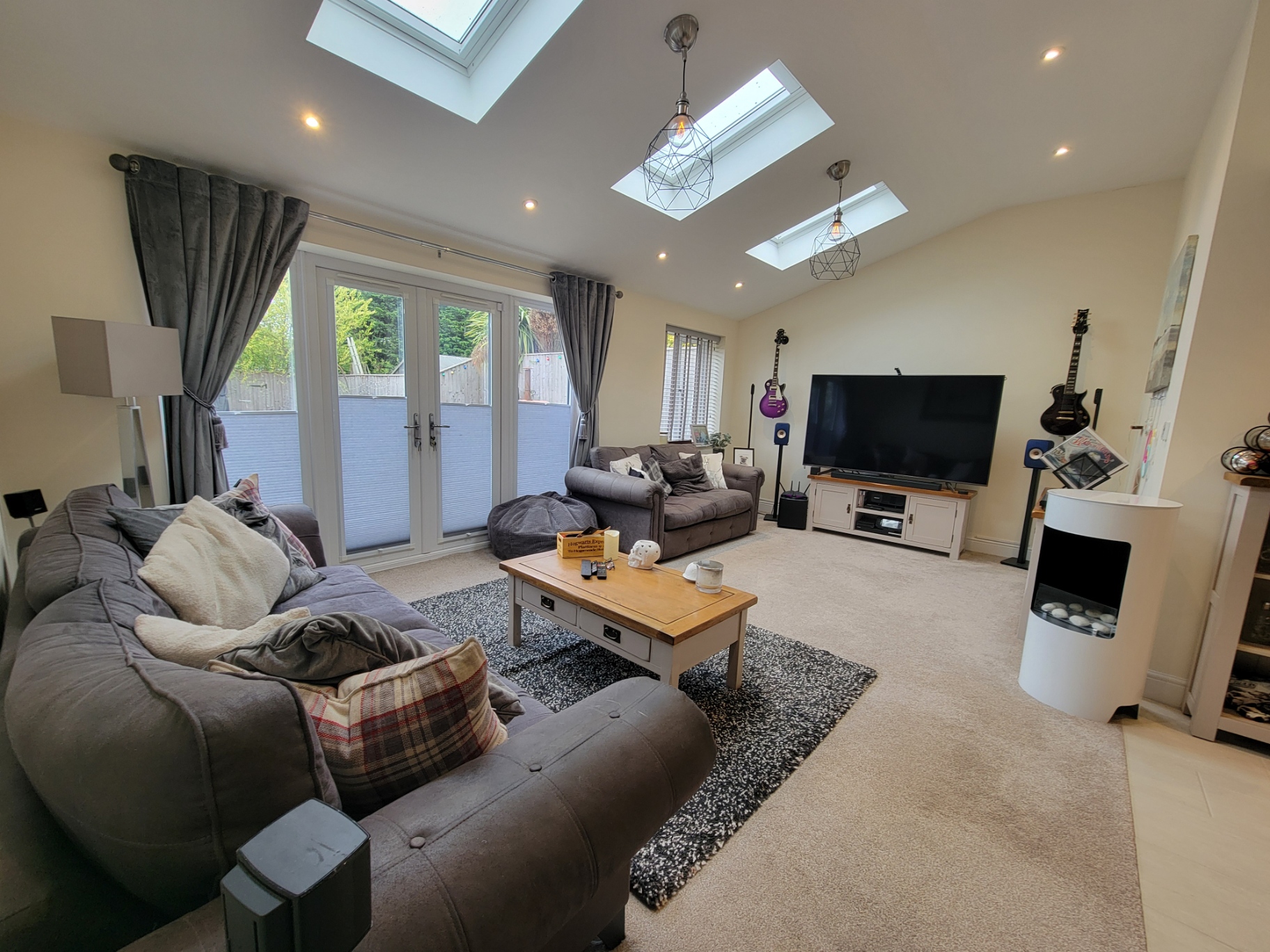 With vaulted ceiling, carpet, three Velux roof lights, electrically operated with blinds, tv point, wide PVC double glazed French doors and side lights opening to the rear garden.